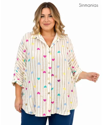 Camisa de algodón estilo over size a rayas estampada con corazones de colores y corazones bordados dorados, manga corta caída abotonada. La parte trasera es más larga que la delantera.
