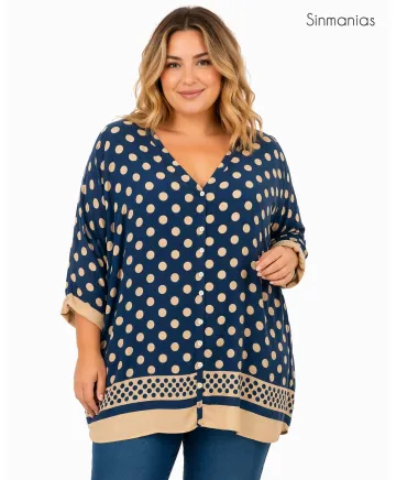 Camisa de topos manga tipo francesa modelo over size, la camisa es a dos colores, el color de los topos es el mismo que el del remate de la manga y el final del bajo. es escote es en "V".