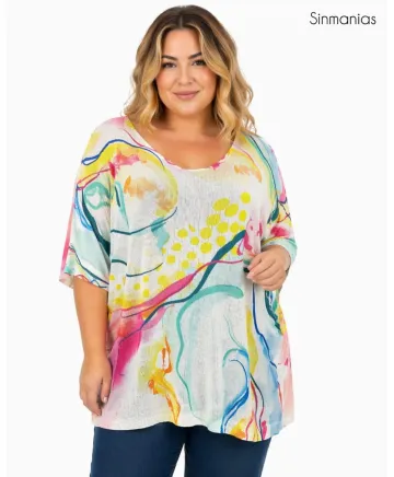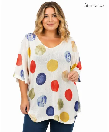 Jersey de punto con escote en "V" estilo over size y estampado de colores con fondo blanco. Talla única. Medidas en la descripción.